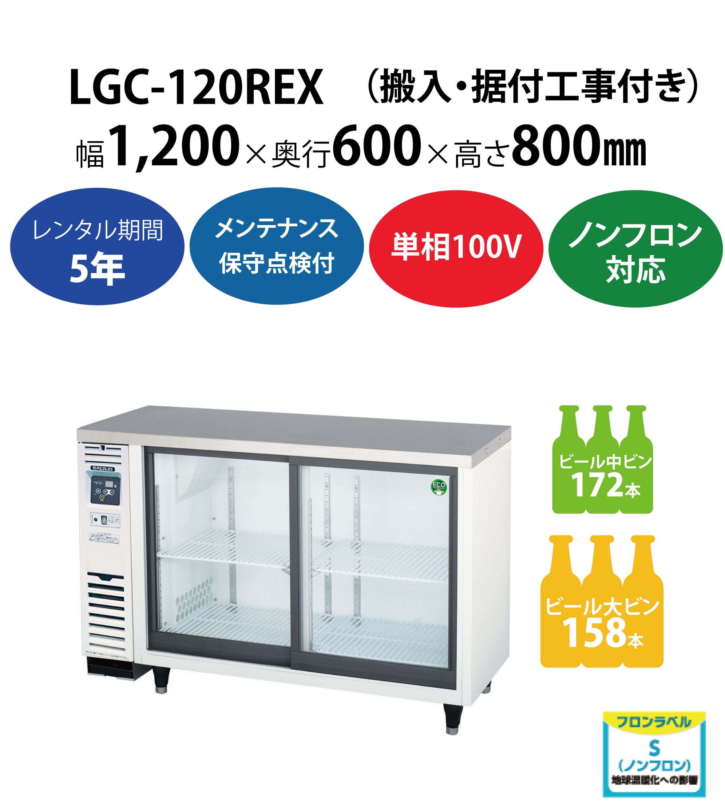 初期費用0円の業務用厨房機器レンタル|【スライド扉小型冷蔵ショーケース】LGU-120REX W1200×D450×H800mm